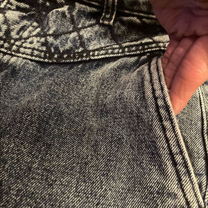 These are pre-owned The Kooples Jeans in a size 26. They are a light blue wash with a distressed look. The jeans have a high waist and a straight leg. They feature a unique diamond-shaped stitching detail on the front and back. The jeans are made of 100% cotton and have a button and zipper closure. They are in good condition with no visible rios it anything