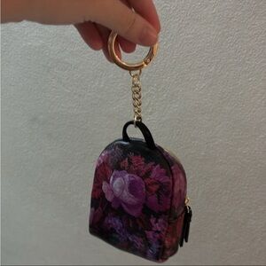 Mini backpack keychain with floral pattern. Features gold logo and keyring.