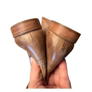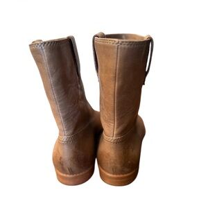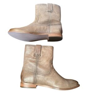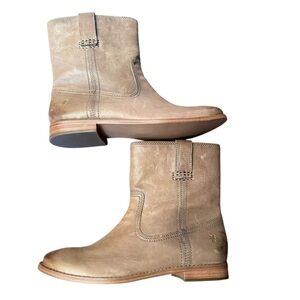 Step out in style with these chic tan leather ankle boots. These boots are brand new, never worn and without the original box. They are the light tan color or what you would call a camel color. They are a little darker color around the toe. This style of short ankle boots is a pull on boot with no zipper . 100% leather and if you’re looking at this, then you know that FRYE makes an exceptionally well crafted shoe/boot. As mentioned in the listing, this is a size 7 1/2 and the shaft height is 6.75 inches. Perfect for any occasion, they offer both comfort and elegance. All of my items are well cared for and come from a clean smoke free home. The retail on these is around 360.00 and up depending on the store. Considerate offers are welcomed.