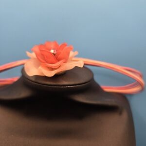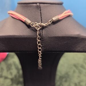 This fun necklace features a delicate resin pink rose pendant that is just under 2 inches. 4 soft suade cords in pink tones that are 14 inches with a 3 inch extender. There is a little rub marks by the pendant bail, but besides that it's in amazing preloved condition. #476