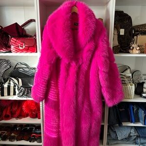 Make a bold statement with this vibrant pink faux fur coat. Perfect for adding a pop of color to your winter wardrobe.