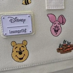 Charming Loungefly backpack with Disney characters. Cream color with fun designs. Embroidery patches