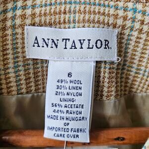 Ann Taylor Wool Linen Blend Blazer in Yellow Plaid. Size 6. Features notch lapel collar, long sleeves, front button closure, and glen plaid print. Shell: 49% Wool, 30% Linen, 21% Nylon. Lining: 56% Acetate, 44% Rayon. Excellent pre-owned condition, no flaws.