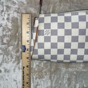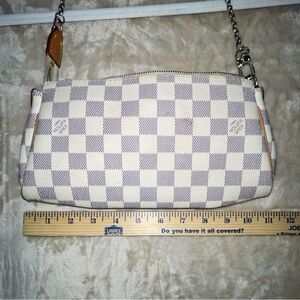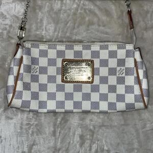 This LOUIS VUITTON Eva Damier Azure Shoulder Handbag is in Good Pre-Owned Condition. There are no rips or holes. However, there are light stains on the interior and the zipper is missing. Please see photos for measurements and details.