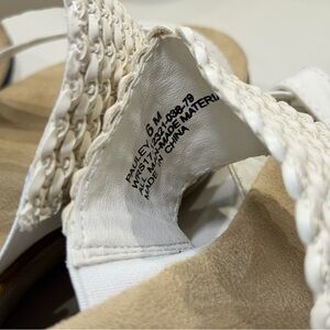 Tags: sandal, slip on, heeled, low heel, open till, comfort, braided, leather, strap, tooled, leather, black, white, brown, gold, bronze, toe strap, wedge, kitten heel, toe loop heel, woven,