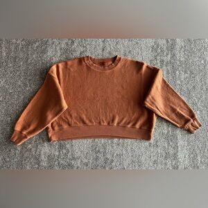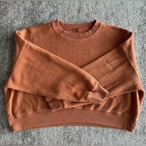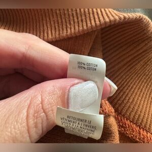 Oversized, cropped, brown/tan in color, super soft and comfy, ribbed material. 100% cotton!
