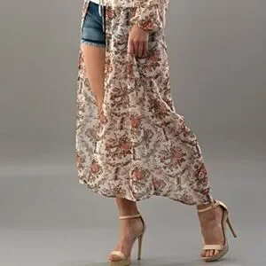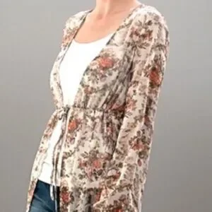 Gorgeous long kimono with long sleeves, elasticized wrist, adjustable tie at waist that you can leave undone or tighten to wear closed. Polyester, true to size. I'm 5'3 and the small comes to the floor on me. Beautiful piece.