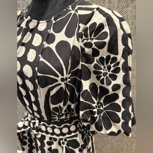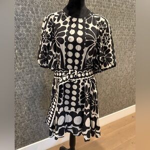 Black and white printed gauze mini dress is lined and has belt. Worn once and dry cleaned. EUC