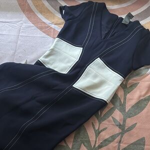 Ann Taylor midi dress in navy and white offers a classic sheath fit, perfect for versatile styling. New with tags, featuring short sleeves and zip back closure.