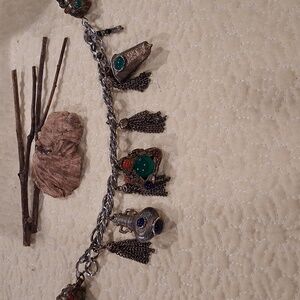 This exquisite vintage charm bracelet features intricate silver detailing with vibrant green and blue accents. Perfect for adding a touch of elegance to any outfit.