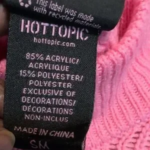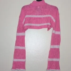 Cute pink cropped sweater featuring a character patch. Long sleeves with white stripes add style.
