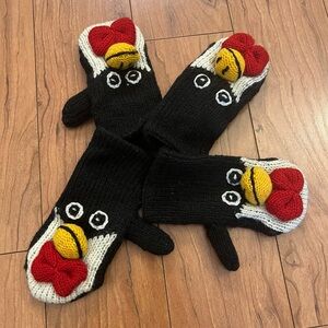 Adorable penguin-themed knit mittens for kids. Features a playful black and white design with red and yellow accents. Perfect for keeping little hands warm and stylish.