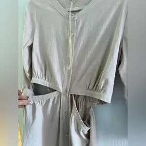 Lovestitch 100% Cotton Cutout Midi Dress Beige Tan Button Front Long Sleeves