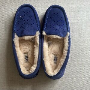 Soft navy suede moccasins with cozy interior. Ideal for lounging.
