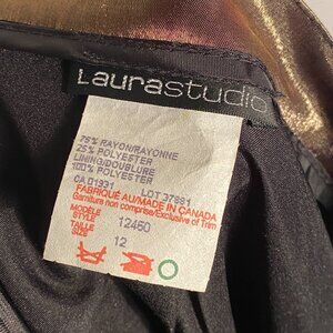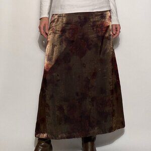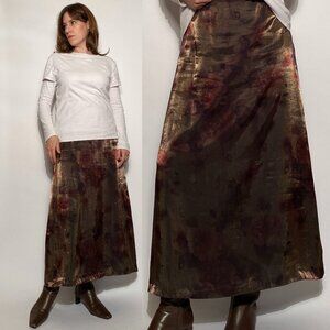 Vintage 1990s darkly romantic iridescent maxi skirt with blurred floral print! Love the colours, antiqued green/gold with wine burgundy red. Can be worn so many ways! The last picture is brightened to show detail.
