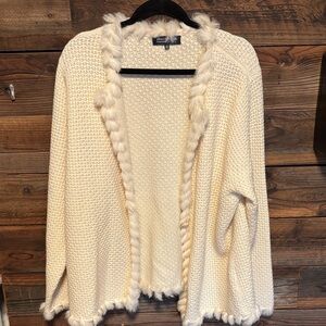 Elegant ivory cardigan with soft faux fur trim. Perfect for layering and adding sophistication.
