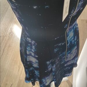 - Exposed zipper in back and button close at the top of zipper Step out in style with this elegant black and blue dress. Perfect for any occasion, it combines comfort with a chic design.