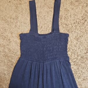 Free People FP Beach Homecoming Jumper One Piece in the color celestial indigo. It features a smocked bodice, wide shoulder straps, and a flowy, ultra-wide-leg silhouette.