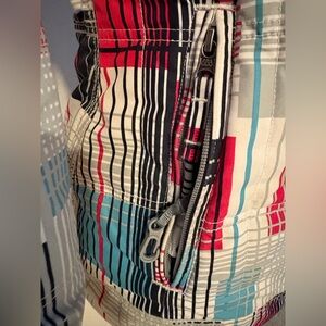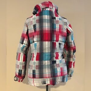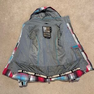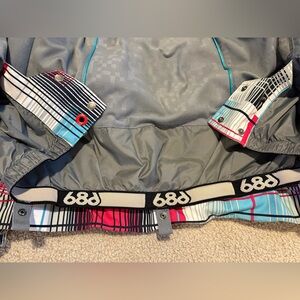Stylish ski jacket by 686. Ideal for cool weather. Featuring bright blues, hot pinks, grays and white. 2 outside pockets with hooks, one pocket inside. 5000mm 5000gm thermal rating 9. In excellent condition as pictured.