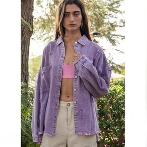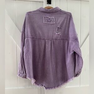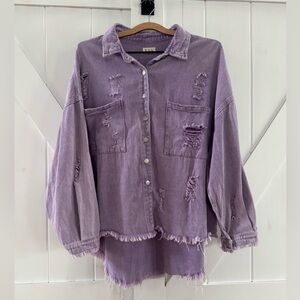 POL Oversized Distressed Purple Denim Button Down Shacket