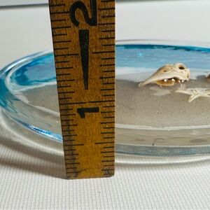 Round resin trinket dish with a beach theme. Features blue ocean waves and sand with seashells. Glass dish with resin design.