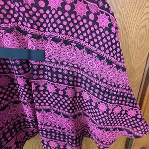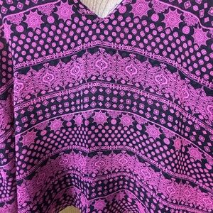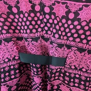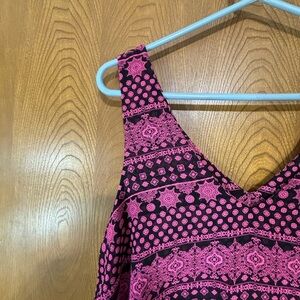 Chic tank top with vibrant pink and black patterns. Perfect for casual outings. V neckline front and back.