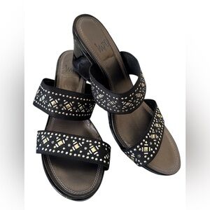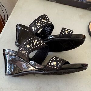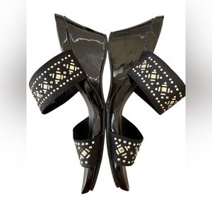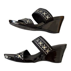 Elegant black wedges featuring sparkling rhinestone patterns. Ideal for stylish occasions.