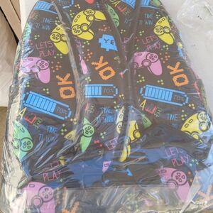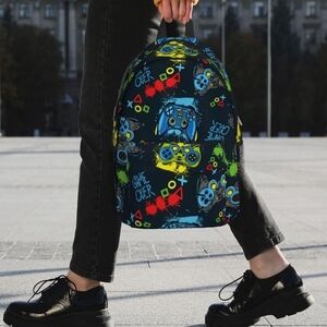 Vibrant backpack with gaming controller design. Features bold colors and playful graphics.