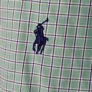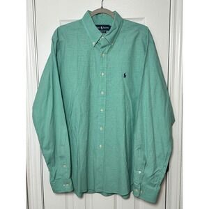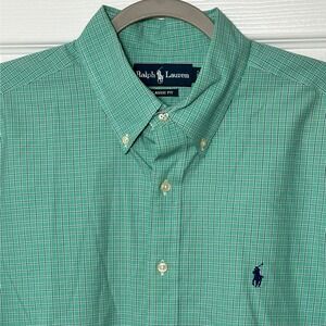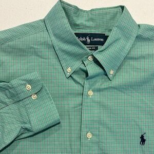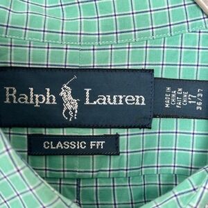 Ralph Lauren Classic Fit men's long sleeve button down shirt in a green plaid pattern. Size 17 36/37. This shirt features a traditional button-down collar, a navy embroidered pony logo on the left chest, and a standard button placket. The classic fit offers a comfortable and relaxed silhouette suitable for everyday wear or business casual settings.