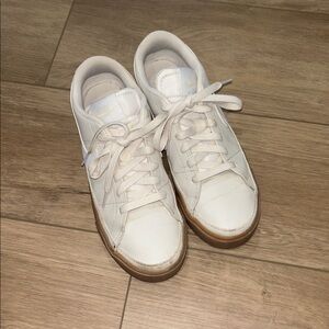 Stylish Nike sneakers for women. Beige upper with white accents. Perfect for casual outings.