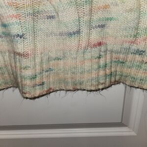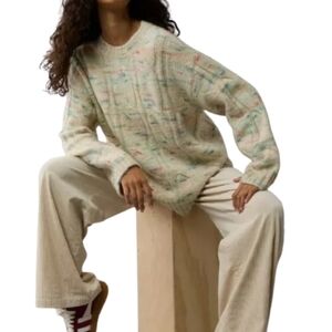 American Eagle Oversized Multicolor Cable Knit Sweater Size XS Relaxed Fit Soft. Long sleeves, very soft cable knit pullover style sweater. Ribbed cuffs, hem and neckline. The sweater is a cream color with pastels throughout. Cable knit but very soft and lighter weight. Super comfortable, oversized and tunic length. Style name is "Whoa So Soft Cable Knit Sweater."