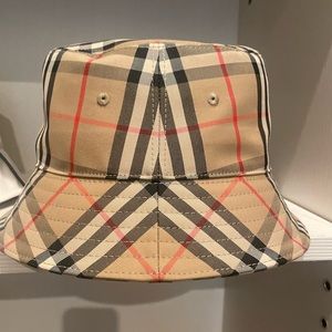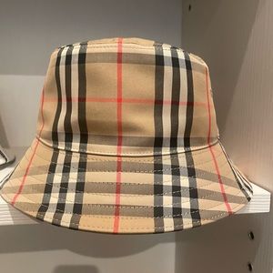 Stylish Burberry bucket hat. Iconic check pattern. Perfect for any occasion.