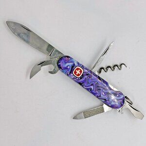 the Wenger Swiss Army Knife Snipe Waves is a multi-tool that combines functionality with a touch of flair.  The vibrant purple handle adds a distinctive touch to its classic design.Discontinued and sought after by collectors, this model 19301 is a testament to Wenger's commitment to quality and durability. Its vintage charm is matched by the reliability that Swiss craftsmanship is known for. PLEASE SEE PHOTOS FOR CONDITION. SHOWS SOME WEAR ON ONE SIDE