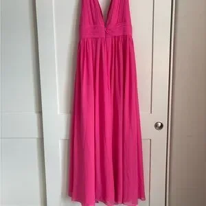 Step into elegance with this stunning pink evening gown. Perfect for any special occasion. Fitted under bust and the empire waist is forgiving from there down. Bump friendly.