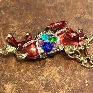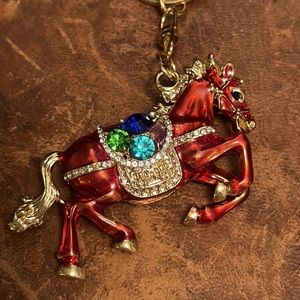 Get up and go with this fun horse keychain/ bag charm! With his vibrant red body and gorgeous blue, green, and pink rhinestone saddle, he’ll carry your keys in style.