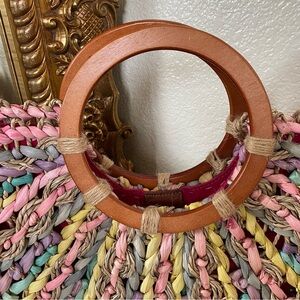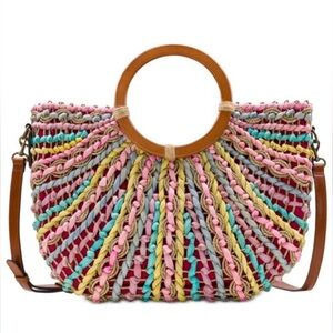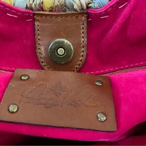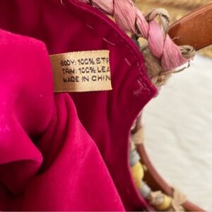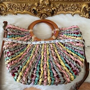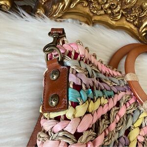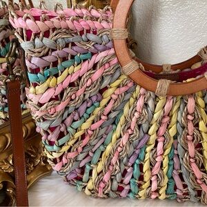 Patrick Nash Specialty Woven Lesa Satchel. Gently worn a few times , 100% straw , 100% leather strap , wood round handles , pastel colored straw, fully lined with one zip pocket and two slip pockets , snap button closure , adjustable strap , strap is also removable. Comes with dust bag . Comes from a non smoking home .