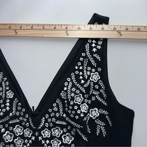 The Maggy London Sleeveless Maxi Dress in size 8 is a stylish and versatile piece perfect for various occasions. The black floral embroidery adds a touch of elegance, while the high slit and V-neckline give it a modern and sophisticated look. Made from polyester knit fabric, this dress is lined for added comfort and has a zipper closure for easy wear. Ideal for summer, fall, and spring, this classic and preppy dress is sure to make a statement whether for a party, casual outing, or formal event.