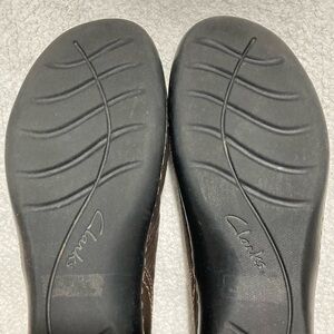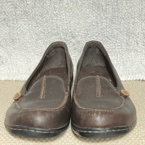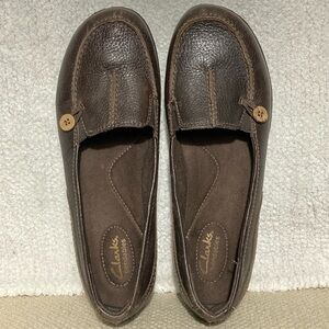 Clarks Women's Brown Leather w/Button Accent Slip On Casual Loafers Shoes. Color: Brown. Pre-owned Condition - refer to pictures for description of shoes. No Rips or Tears. Smoke-Free.