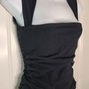 Chic black top with stylish cutout design and ruched sides. Sexy stretchy top that's perfect for modern looks.
