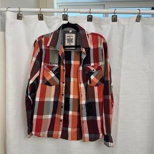 Stylish red and black plaid button-up shirt. Perfect for casual outings. really unique design mj.R/98. It’s got a zipper on the side of the one pocket lock buttons MUFTI wear this shirt with love and pride do not lose it in any time made in India. 21” ptp Red and Black Plaid Button-Up Shirt