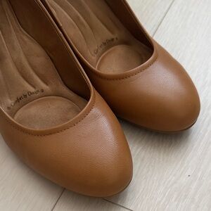 Brown leather heels by Sofft offer a classic touch to any outfit. Designed for comfort and style, these preowned shoes show minimal wear.