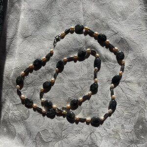 This necklace features black tourmalinated quartz beads, also known as black rutilated quartz, interspersed with baroque white freshwater pearls and decorative silver-tone metal spacer beads. The unique black, needle-like inclusions within the clear quartz are a distinctive characteristic of tourmalinated quartz or rutilated quartz.