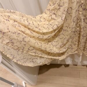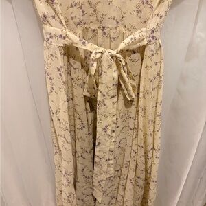 Charming cream midi dress with floral design. Features short sleeves and lace details. Vintage dress from the 80s by Gunne Sax. Dress buttons up the front and ties in the back. Dress has short sleeves with buttons and lace detailing on the front. No size tag. Dress has staining in the underarms, see last two photos.