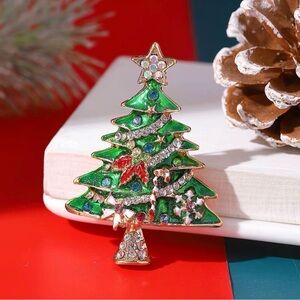 Sparkling Christmas tree brooch with green and gold accents. Perfect for holiday outfits.