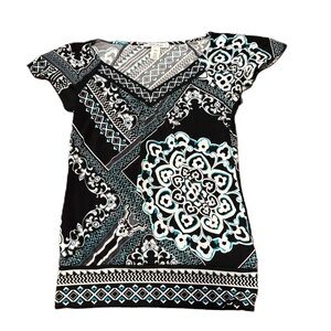 White House Black Market Black and White Geometric Blouse XXS V-neck Boho Blue