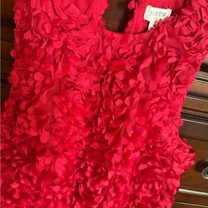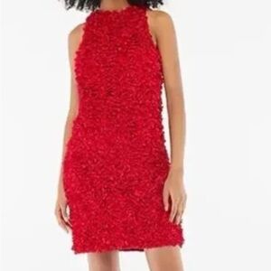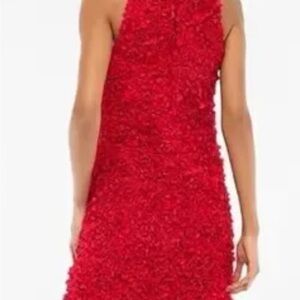 Charming red dress with textured floral design. Perfect for formal occasions. Comfortable and elegant.