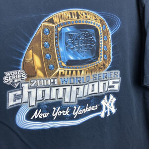 Celebrate the 2009 World Series victory of the New York Yankees with this blue unisex adult t-shirt. Featuring the team's logo and "Champions" lettering, this shirt is made by Alstyle and is size XL Perfect for fans of the Major League Baseball team, it is a great addition to any collection of sports memorabilia.