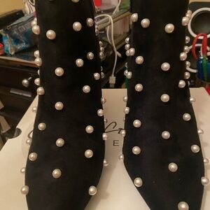 Elegant black ankle boots adorned with pearl studs for a chic look. 3” tapered heel Perfect for adding a touch of sophistication to any outfit.