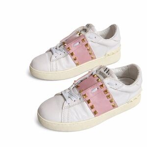 Authentic Valentino Garavani Rockstud Untitled sneakers in white leather with signature pink panel and gold-tone pyramid studs. A classic luxury sneaker style that pairs effortlessly with casual and elevated looks.
