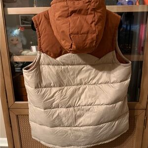 The Patagonia Bivy Women's Size XL Down Vest is a versatile and stylish outerwear piece perfect for outdoor travel and activities. Made with recycled materials, this vest features a full zip with snap closure, a hood for added protection, and a comfortable regular fit. The 75% recycled down feathers insulation ensures warmth during various seasons, while the tan and brown color and logo accents add a touch of classic style. With its lightweight design and convenient pockets, this puffer vest is a must-have for the modern outdoor enthusiast.